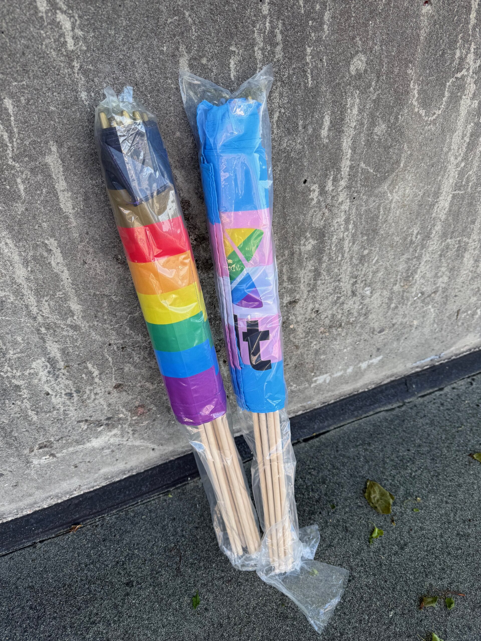 str. flagg 30 x 45 cm – med trestang – total lengde på stang ca. 65 cm.